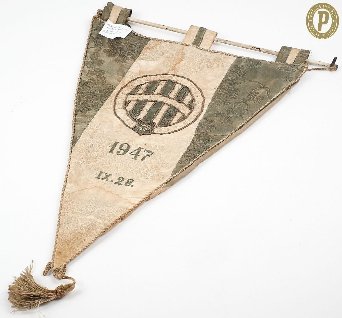 Deák Ferenc FTC-s zászlója az 1947. szeptember 28-i MATEOSZ MSE – FTC bajnoki mérkőzésről, amelyet Deák góljával 1–0-ra nyert meg a Fradi. (Fotó: Puskás Intézet/Deák-hagyaték)