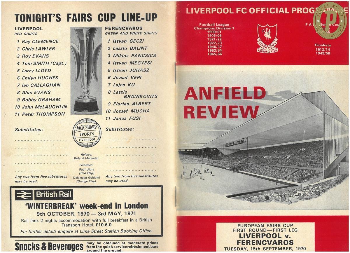Az 1970. szeptember 15-i Liverpool – FTC 1–0 Vásárvárosok-kupája-mérkőzés programfüzete. (Fotó: Puskás Intézet)