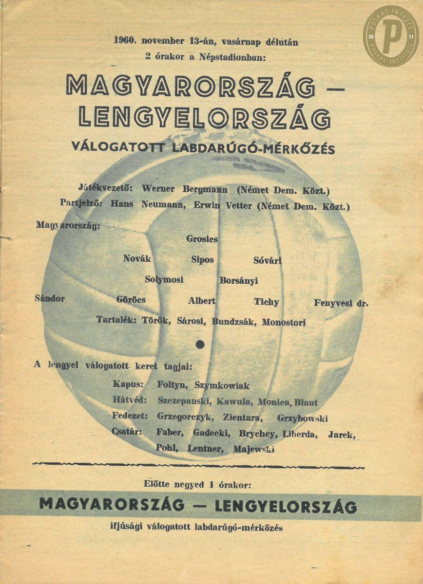 Az 1960. november 13-i Magyarország – Lengyelország (4–1) barátságos mérkőzés műsorfüzete – Monostori Tivadar ezen az összecsapáson volt először kezdő a nemzeti csapatban, s rögtön duplázott.