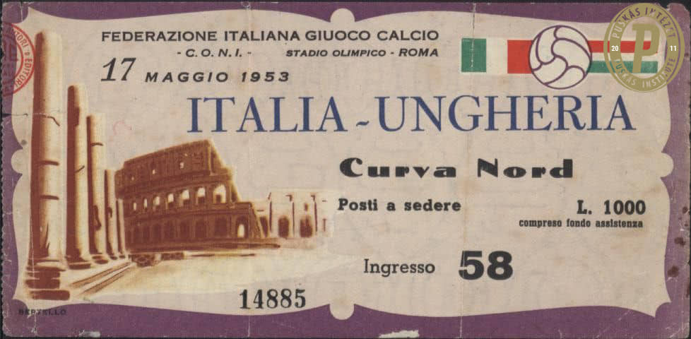 Az 1953-as olasz-magyar Európa Kupa-mérkőzés belépője (Puskás Intézet)