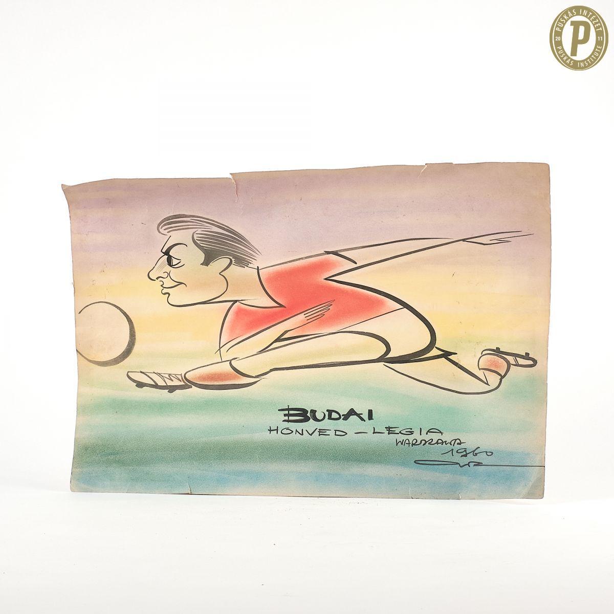 Karikatúra Budairól Honvéd-mezben, 1960. (Budai II-hagyaték/ Puskás Intézet)