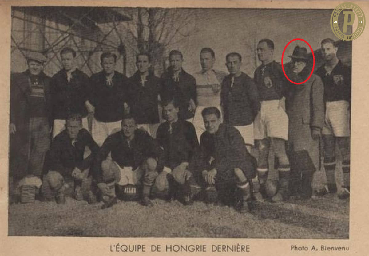 Az 1938-as világbajnoki ezüstérmes magyar válogatott tagjai Dietz Károllyal (Puskás Intézet)
