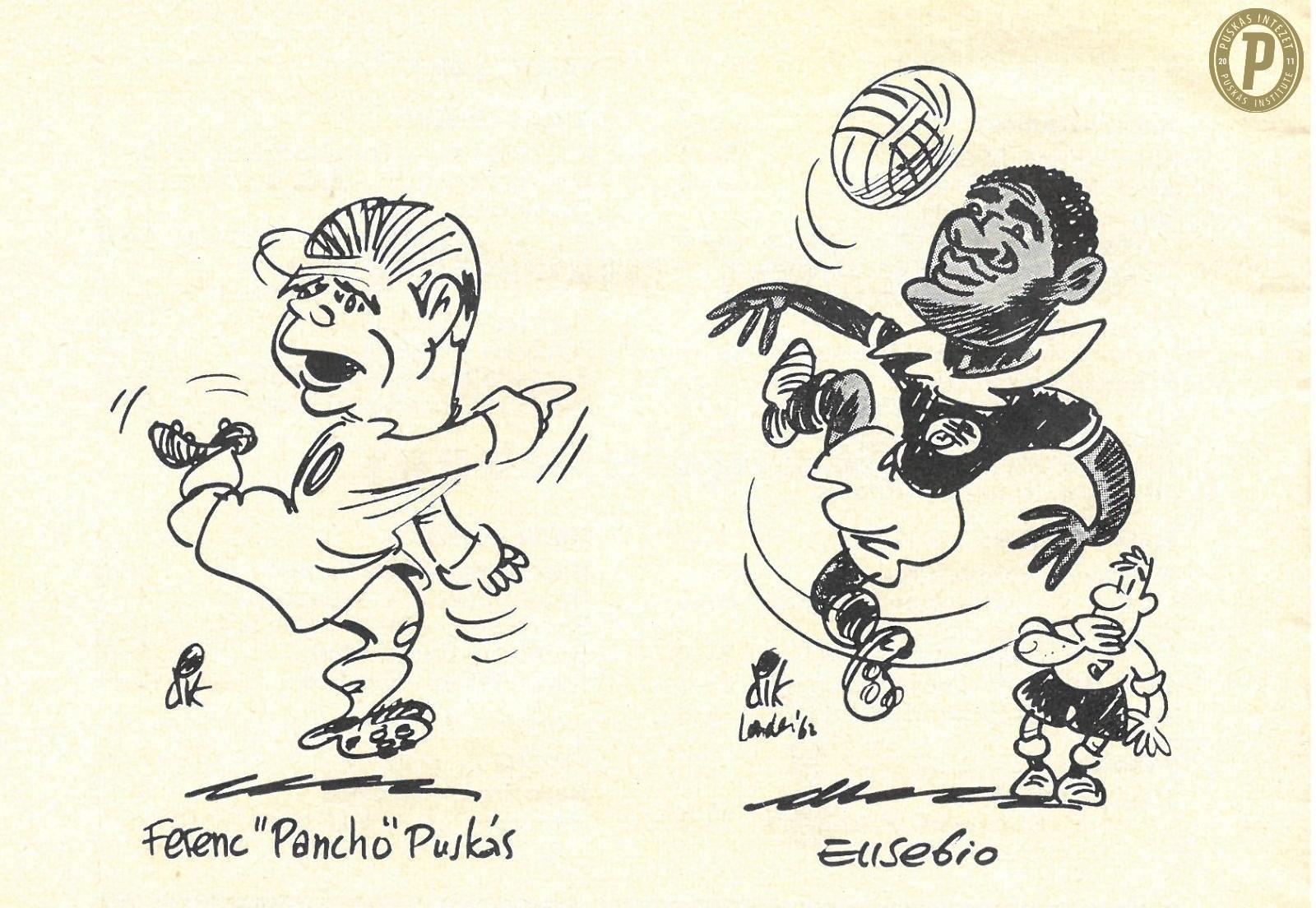 Puskás Ferenc és Eusébio karikatúrája az 1962-es BEK-döntő műsörfüzetében. (Fotó: Puskás Intézet)