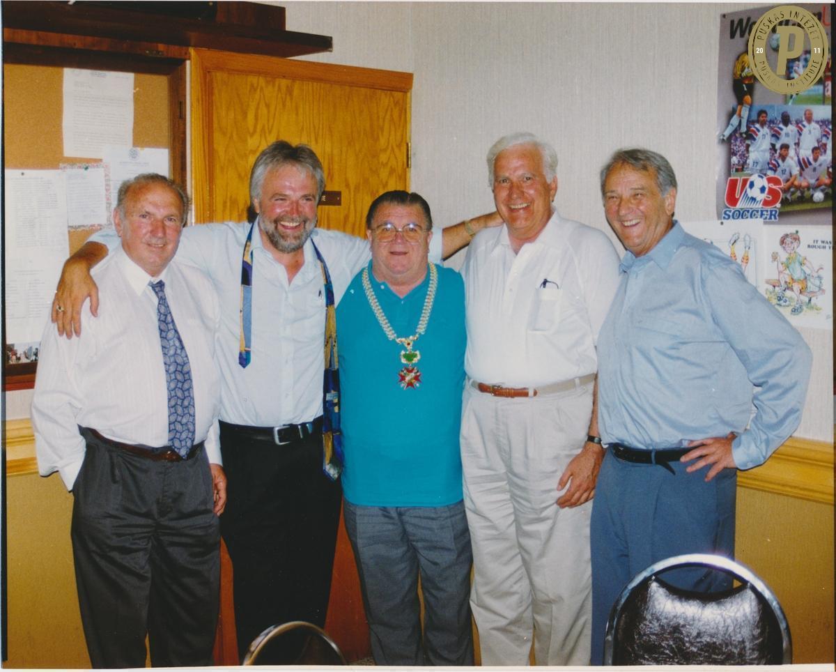 Balról jobbra: Hidegkuti Nándor, Kőrösi László chicagói futballmenedzser, Puskás Ferenc, Harmath István chicagói újságíró és Szepesi György. (Fotó: Puskás Intézet)