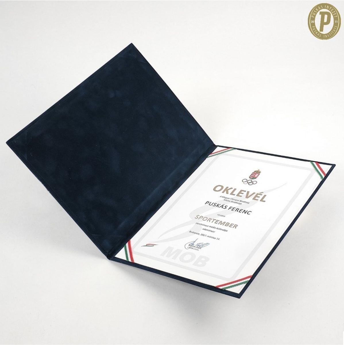 A kitüntetés mellé járó díszoklevél (Fotó: Puskás Intézet)