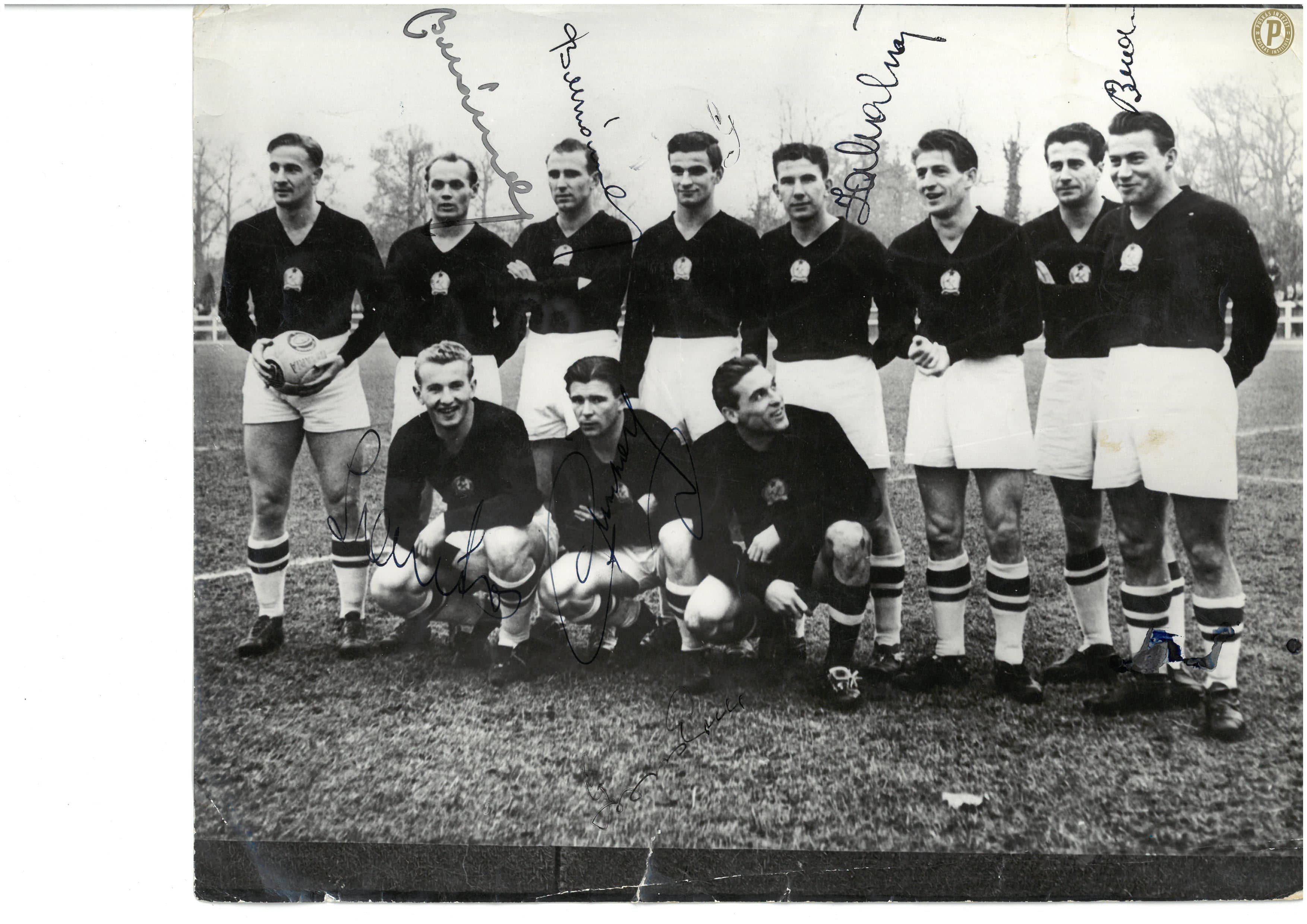 Az Aranycsapat tagjainak aláírásával ellátott fotó (Puskás Intézet)