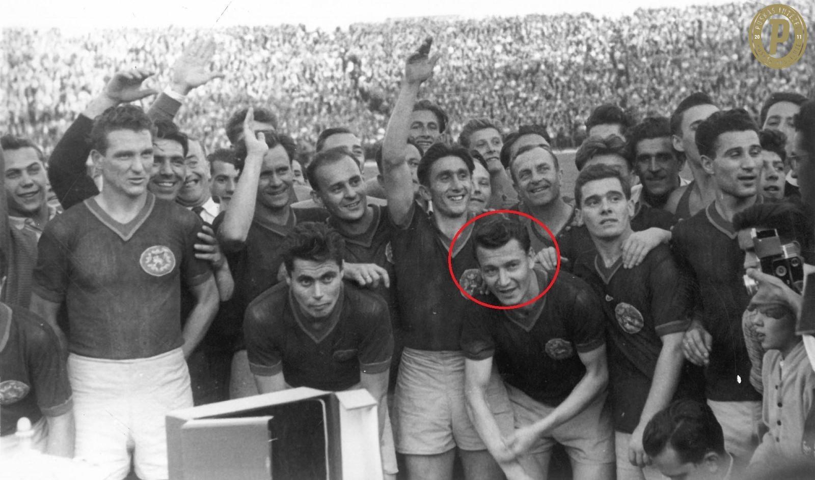 Kontha Károly ünnepli csapattársaival az 1956-os Közép-európai Kupa-győzelmet a Népstadionban (fotó: Puskás Intézet)