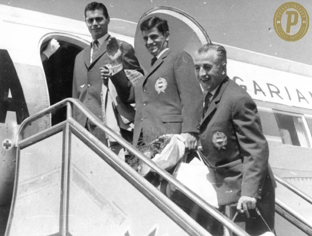 Sárosi László, Menczel Iván és Baróti Lajos a Ferihegyi repülőtéren 1962. május 9-én, a magyar labdarúgó-válogatott olaszországi utazása előtt (fotó: Puskás Intézet/Menczel-hagyaték)