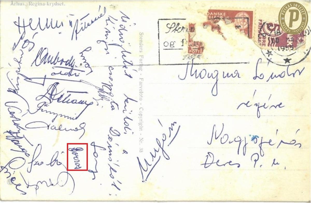 Ferencvárosi képeslap Dániából Borsos Miklós aláírásával, 1955. (Fotók: Puskás Intézet)