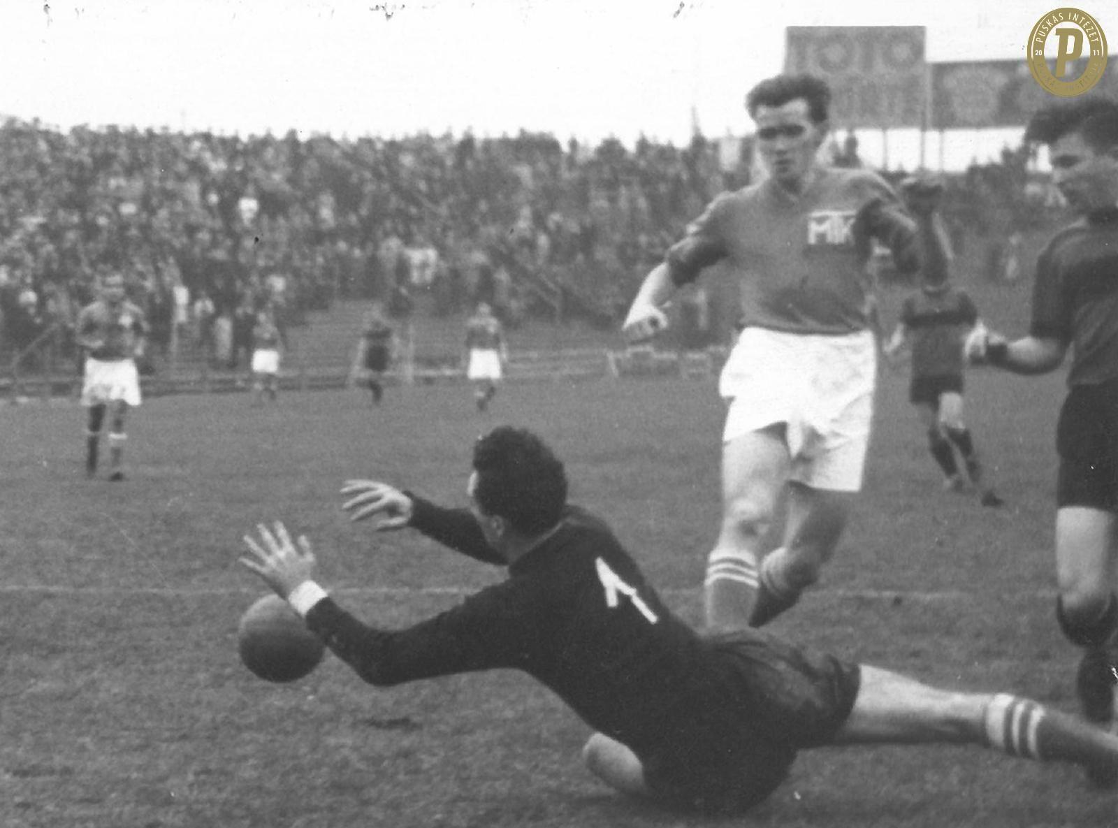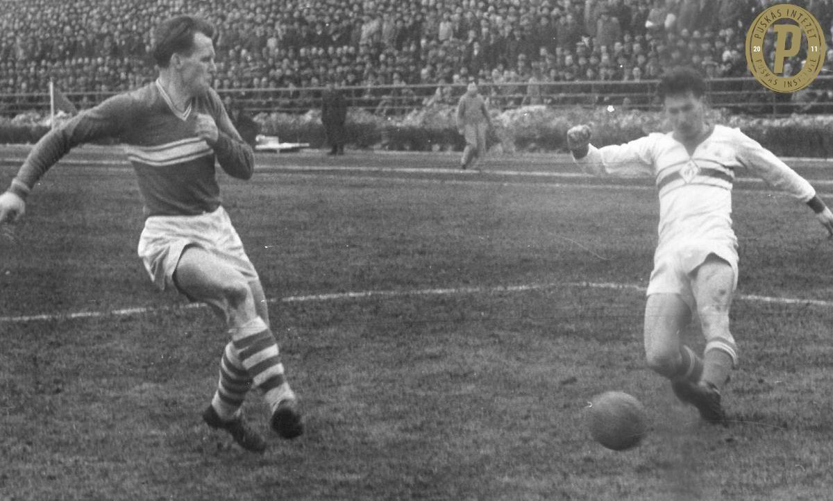 Börzsei János (sötét mezben) az 1956. március 17-i Budapesti Vörös Lobogó SK – BP. Dózsa (1–1) NB I-es mérkőzésen. (Fotó: Puskás Intézet)