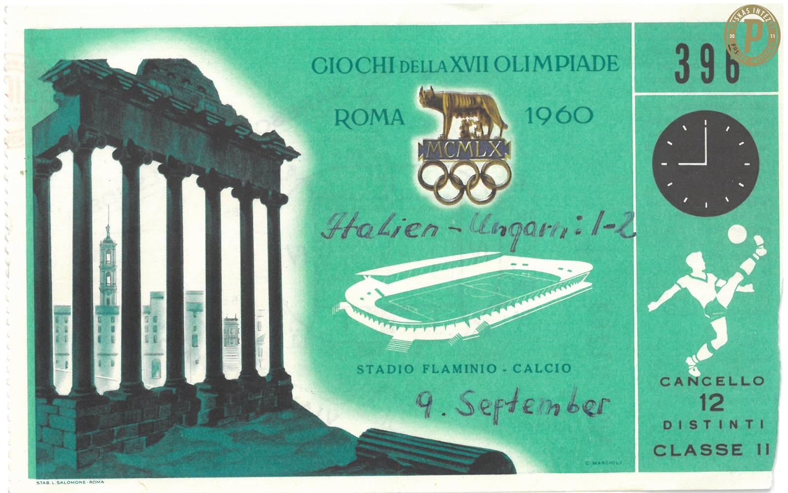 Belépőjegy az 1960-as olimpia bronzmérkőzésére (Olaszország – Magyarország 1–2). (Fotó: Puskás Intézet)