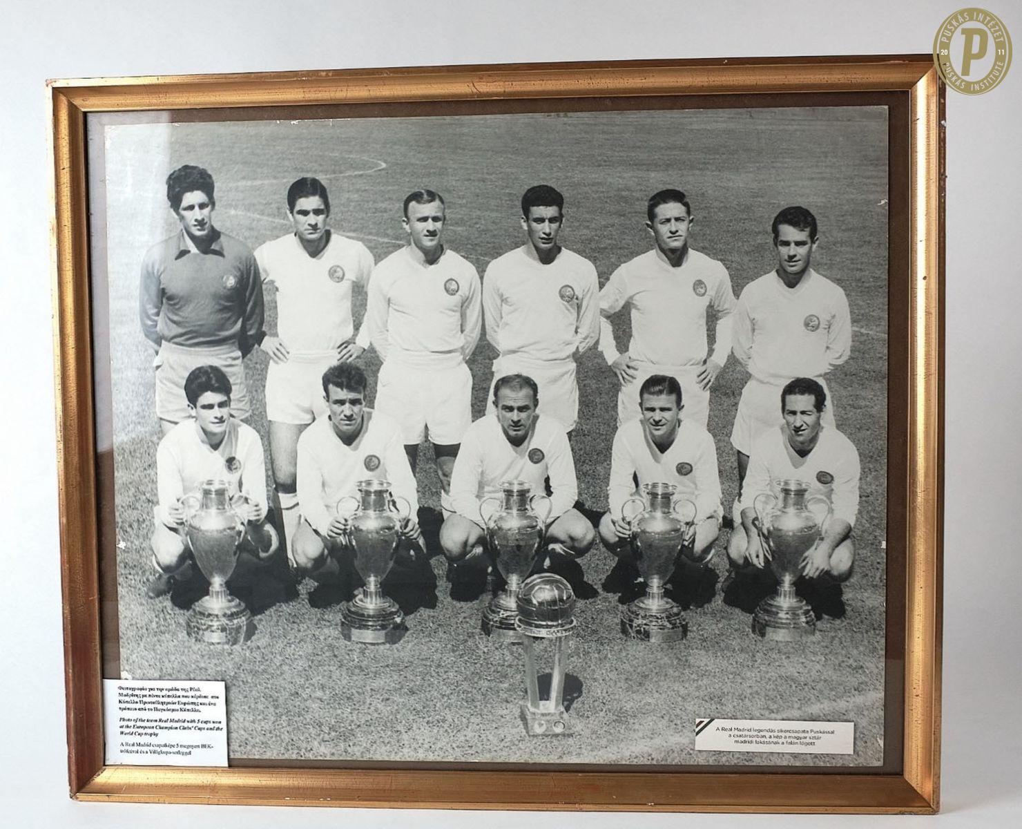 A Real Madrid csapata az öt BEK-serleggel és a Világkupával. A tabló Puskás Ferenc madridi lakásának falán volt kitéve. (Fotó: Puskás Intézet)