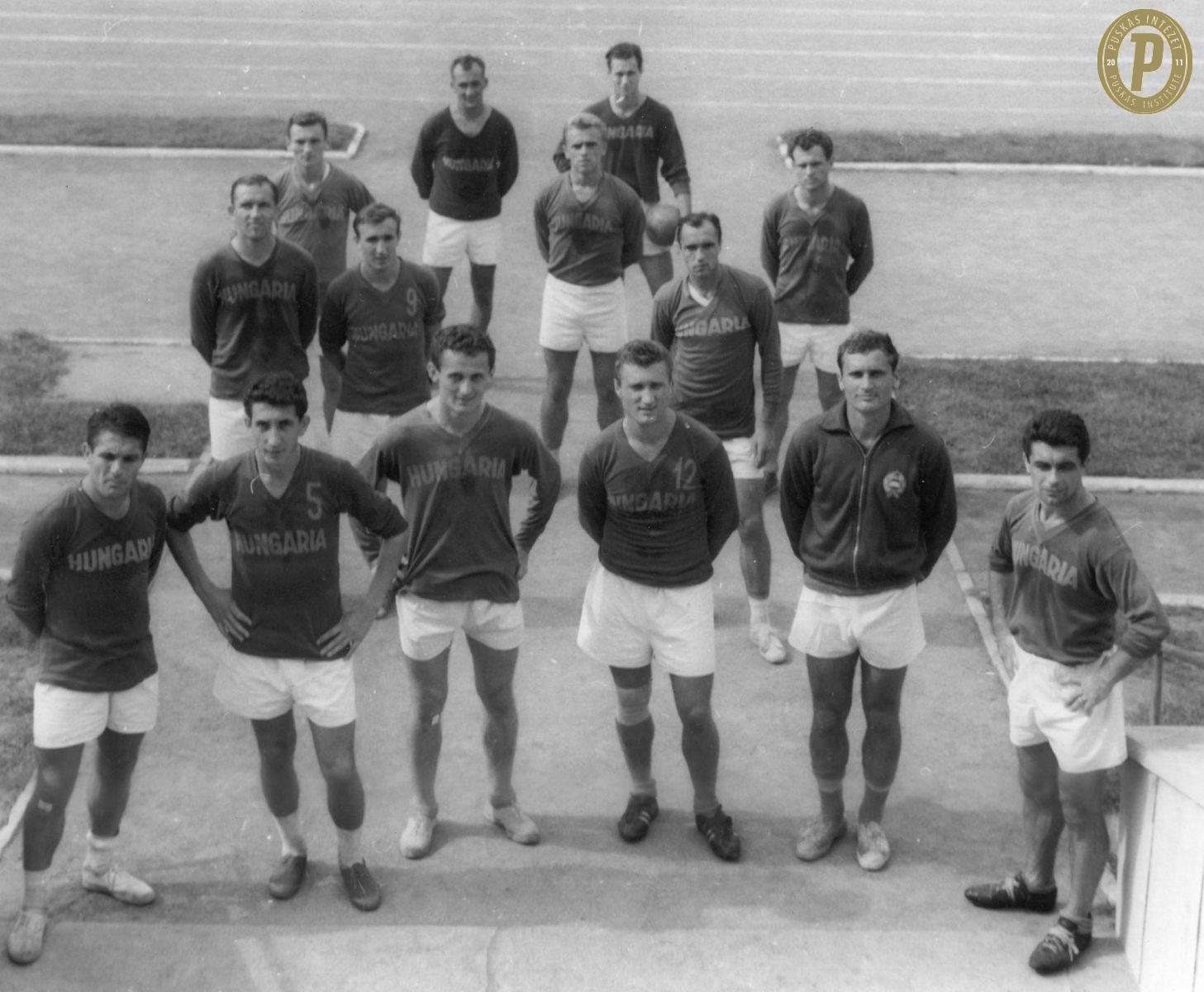 Fenyvesi Máté (első sorban balról a hatodik) és a magyar labdarúgó-válogatott tagjai az 1963. szeptember 21-i Szovjetunió – Magyarország (1–1) barátságos mérkőzés előtt. (Fotó: Puskás Intézet)