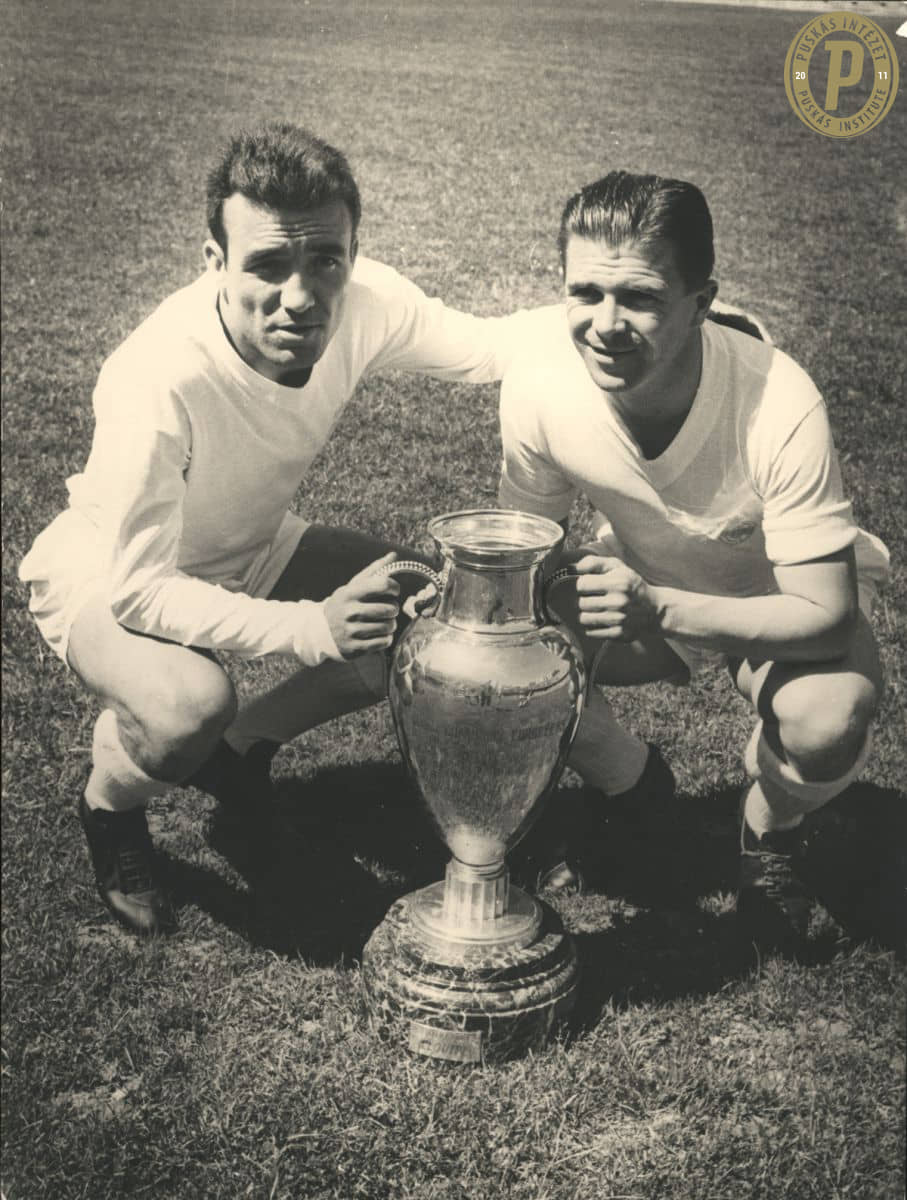 Luis del Sol és Puskás Ferenc a BEK-trófeával (Puskás Intézet)