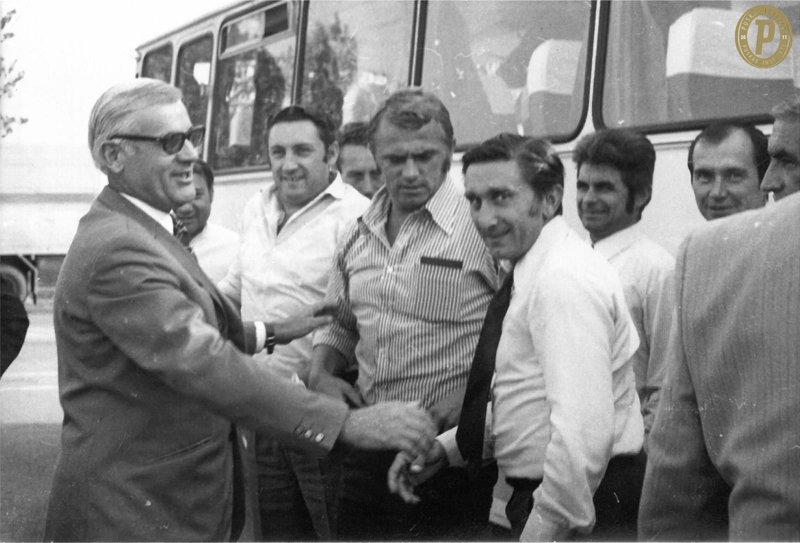 Raduly József (fehér ingben) Mészöly Kálmánnal. (Fotó Puskás Intézet)