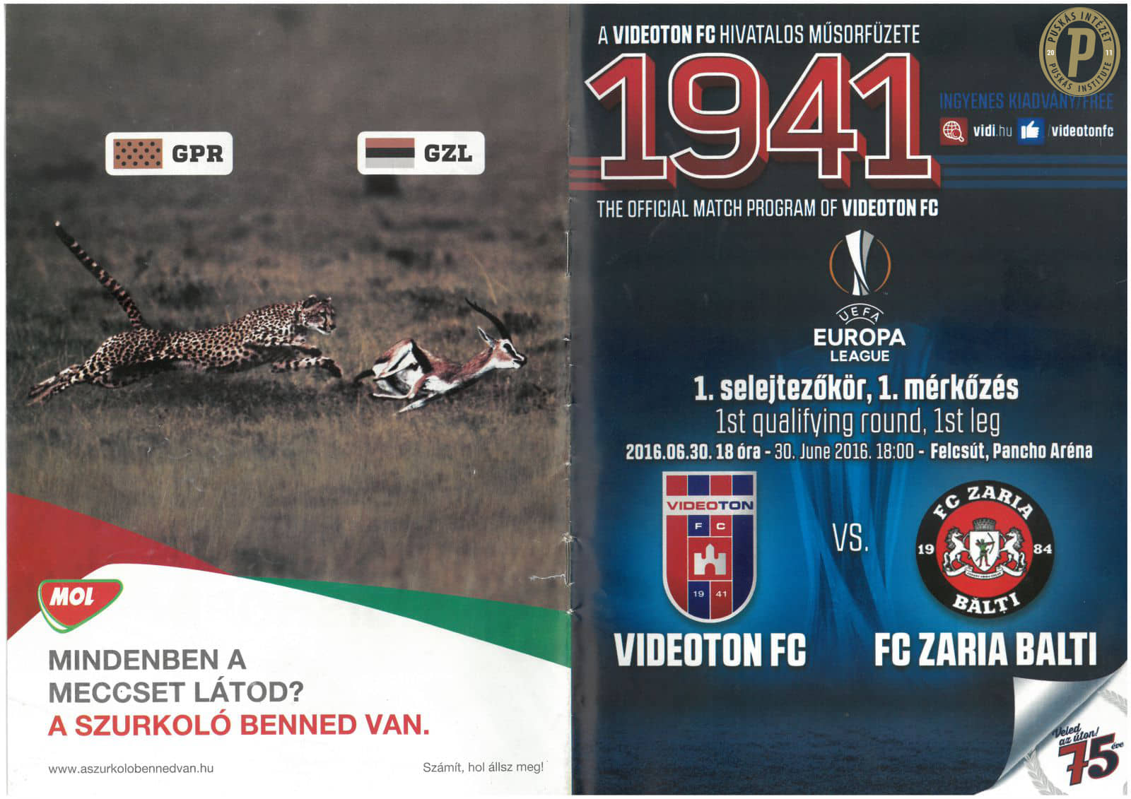 A Pancho Aréna első nemzetközi kupamérkőzésének hivatalos műsorfüzete (Puskás Intézet)