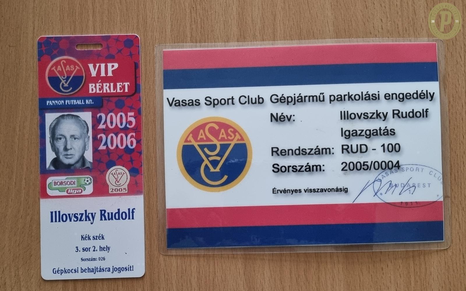 Illovszky Rudolf Vasas VIP bérlete és parkoló engedélye a 2005–2006-os szezonból. (Fotó: Puskás Intézet)