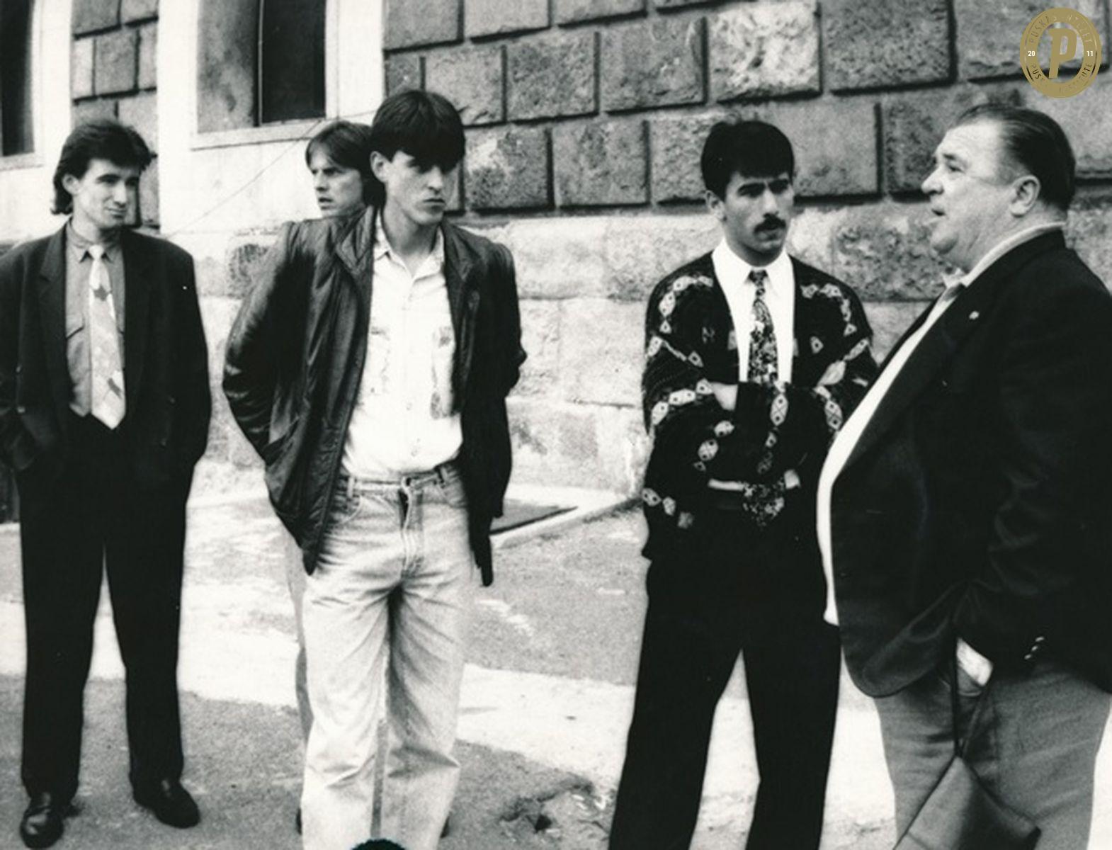 Márton Gábor, Csábi József és Pisont István Puskás Ferenccel a válogatott összetartásán a Népstadion toronyépületénél. (Fotó: Puskás Intézet)