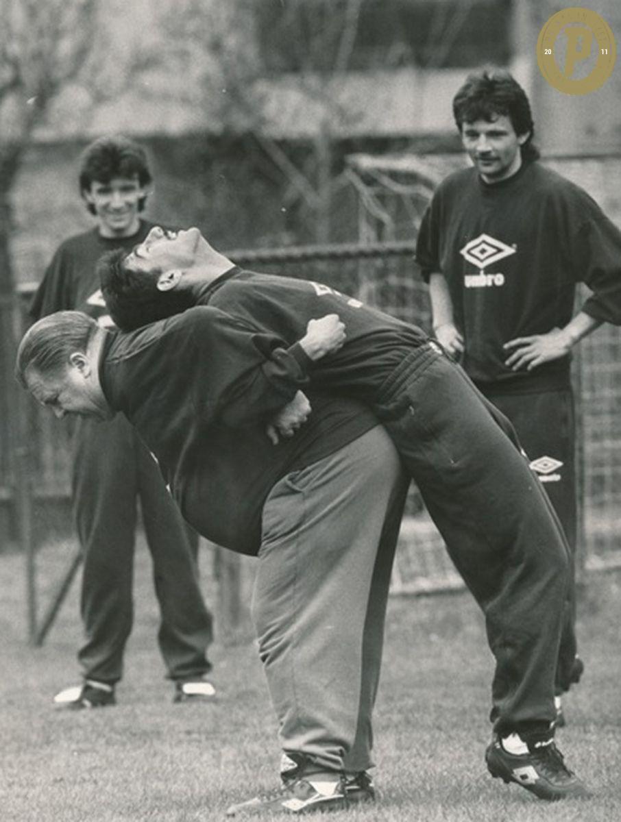 Illés Béla és Répási László figyeli Puskás Ferencet a válogatott edzésén. (Fotó: Puskás Intézet)