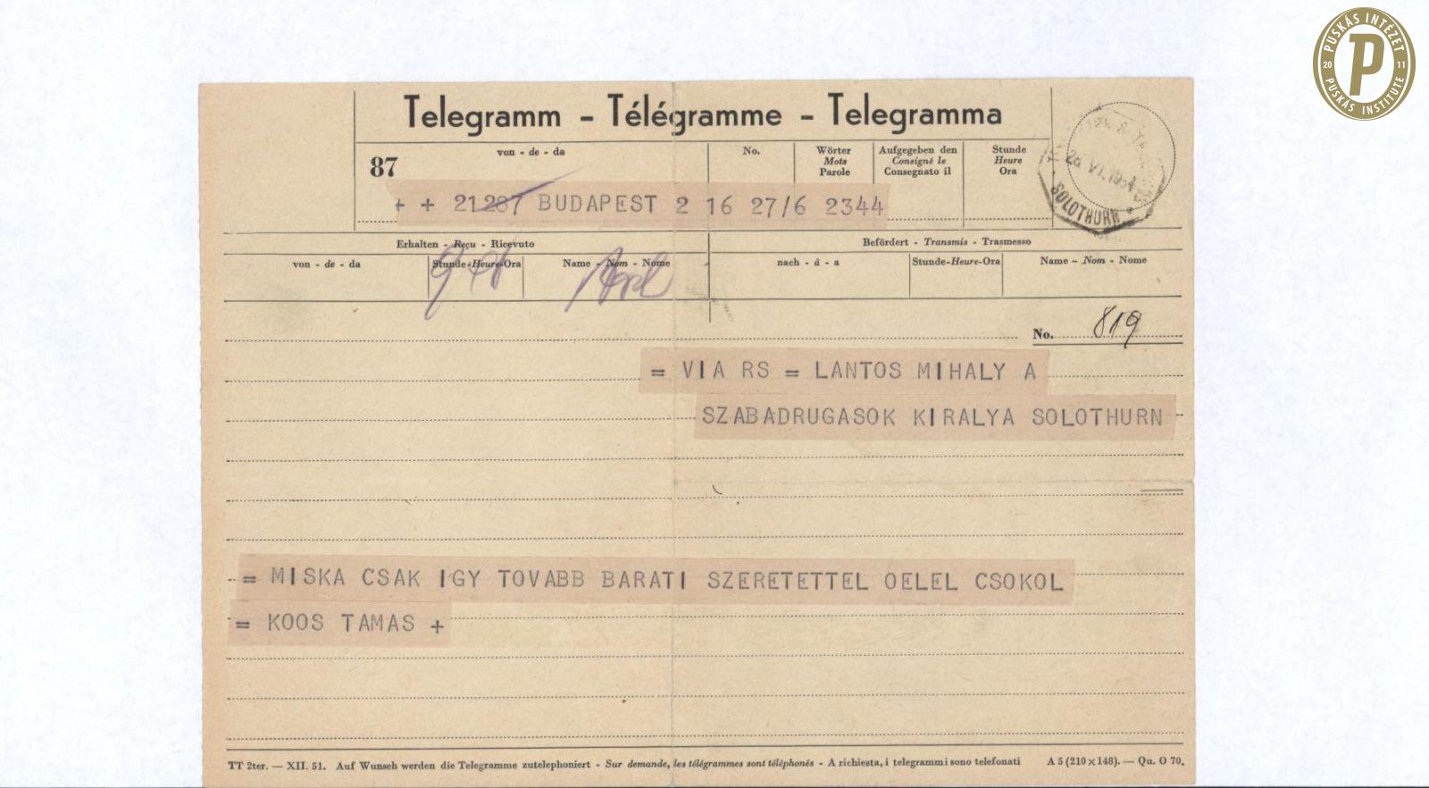 Lantos Mihály 1954-es világbajnokság idején kapott távirat Koós Tamástól (Puskás Intézet)