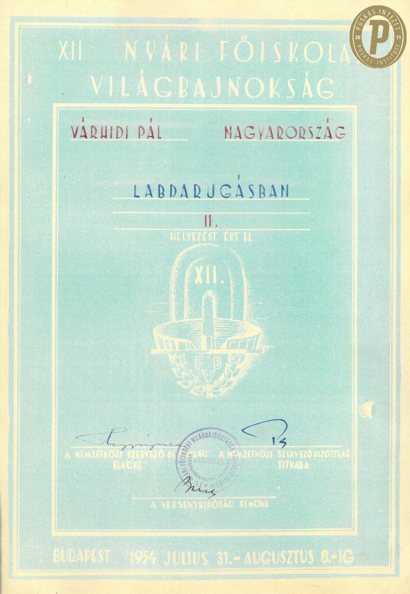 Várhidi Pál oklevele az 1954-es Nyári Főiskolai világbajnokságról, ahol második helyen végzett a magyar csapat. (Fotó: Puskás Intézet)