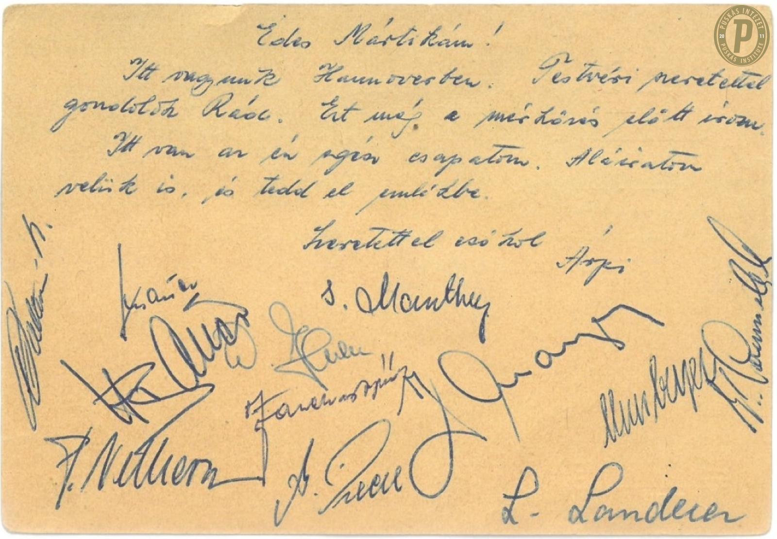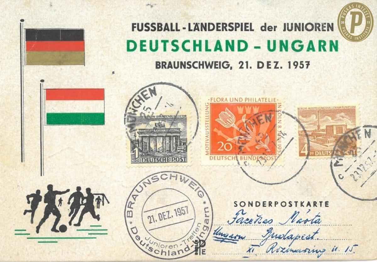 Fazekas Árpád Magyarországra küldött üdvözlőlapja, a Bayern München játékosainak az aláírásával, amelyet az 1957-es nyugatnémet kupa-döntő előtt adott fel. (Fotók: Puskás Intézet/Fazekas-hagyaték)