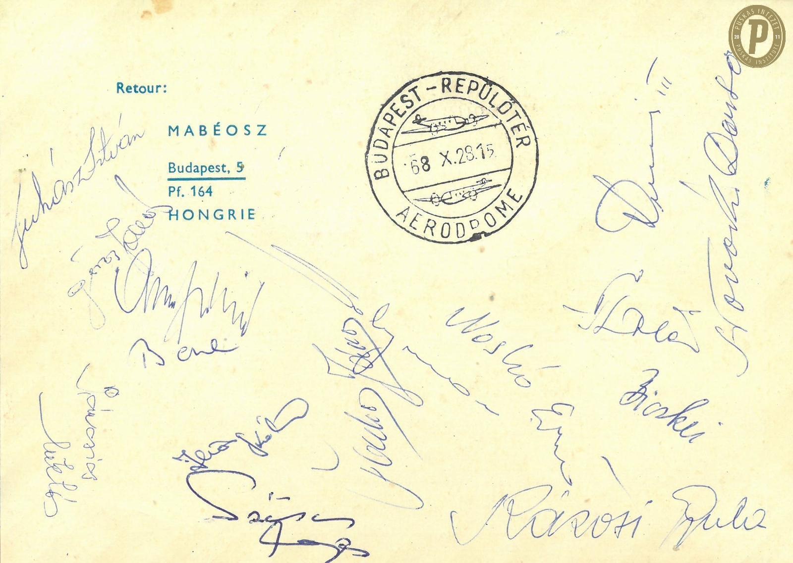 Az 1968-as olimpián résztvevő magyar labdarúgó-válogatott üdvözlőlapja– Páncsics Miklós aláírásával. (Fotó: Puskás Intézet)