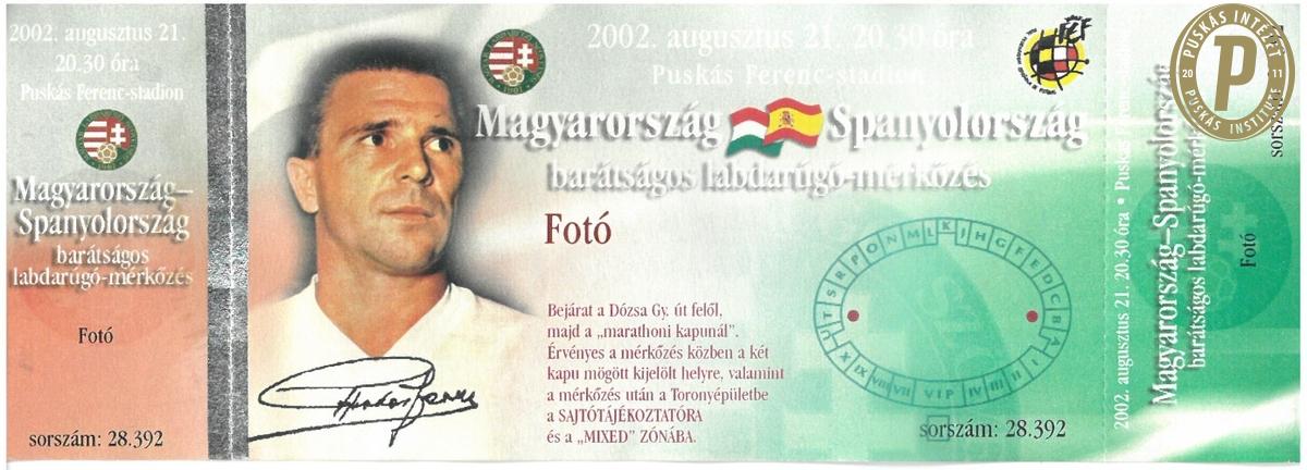 A 2002. augusztus 21-i Magyarország – Spanyolország (1–1) barátságos mérkőzés belépőjegye. (Fotó: Puskás Intézet/Puskás-hagyaték)
