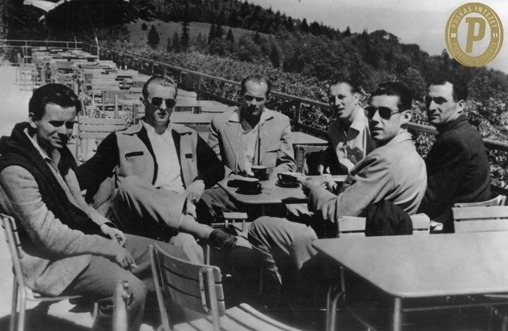 Kárpáti Béla, Lantos Mihály, Buzánszky Jenő, Kovács Imre, Palotás Péter és Gellér Sándor az 1954-es svájci világbajnokság idején (fotó: Puskás Intézet)