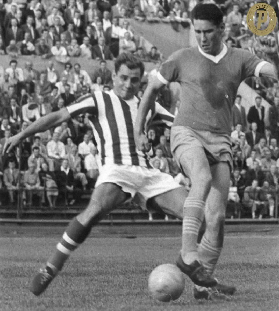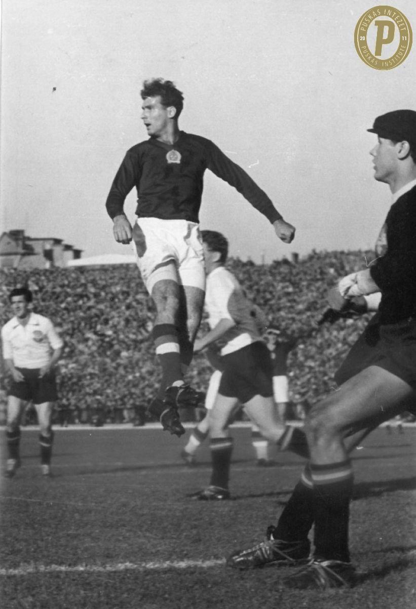 Palotás Péter (jobbra fehérben) győztes gólja az 1955. december 4-i Vörös Lobogó – Pécsi Dózsa (1–0) NB I-es mérkőzésen A Népstadionban (fotó: Puskás Intézet)