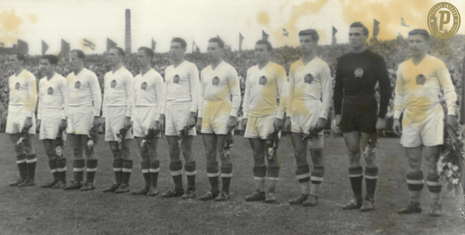 A magyar kezdőcsapata (balról jobbra): Börzsei János, Bozsik József, Kovács József, Kovács Imre, Babolcsay György, Palotás Péter, Tóth III István, Budai II László, Kocsis Sándor, Grosics Gyula, Puskás Ferenc az 1950. szeptember 24-i Magyarország–Albánia (12–0) barátságos mérkőzésen (fotó: Puskás Intézet)