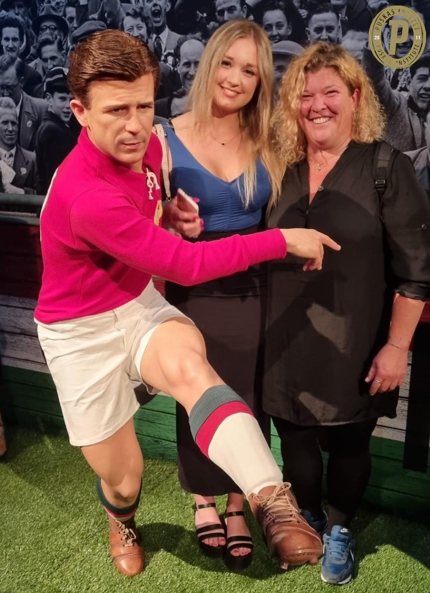 Puskás Ferenc viaszszobra, és Puskás Ferenc dédunokája, Ane és Puskás Ferenc unokája, Réka. (Fotó: Puskás Intézet)