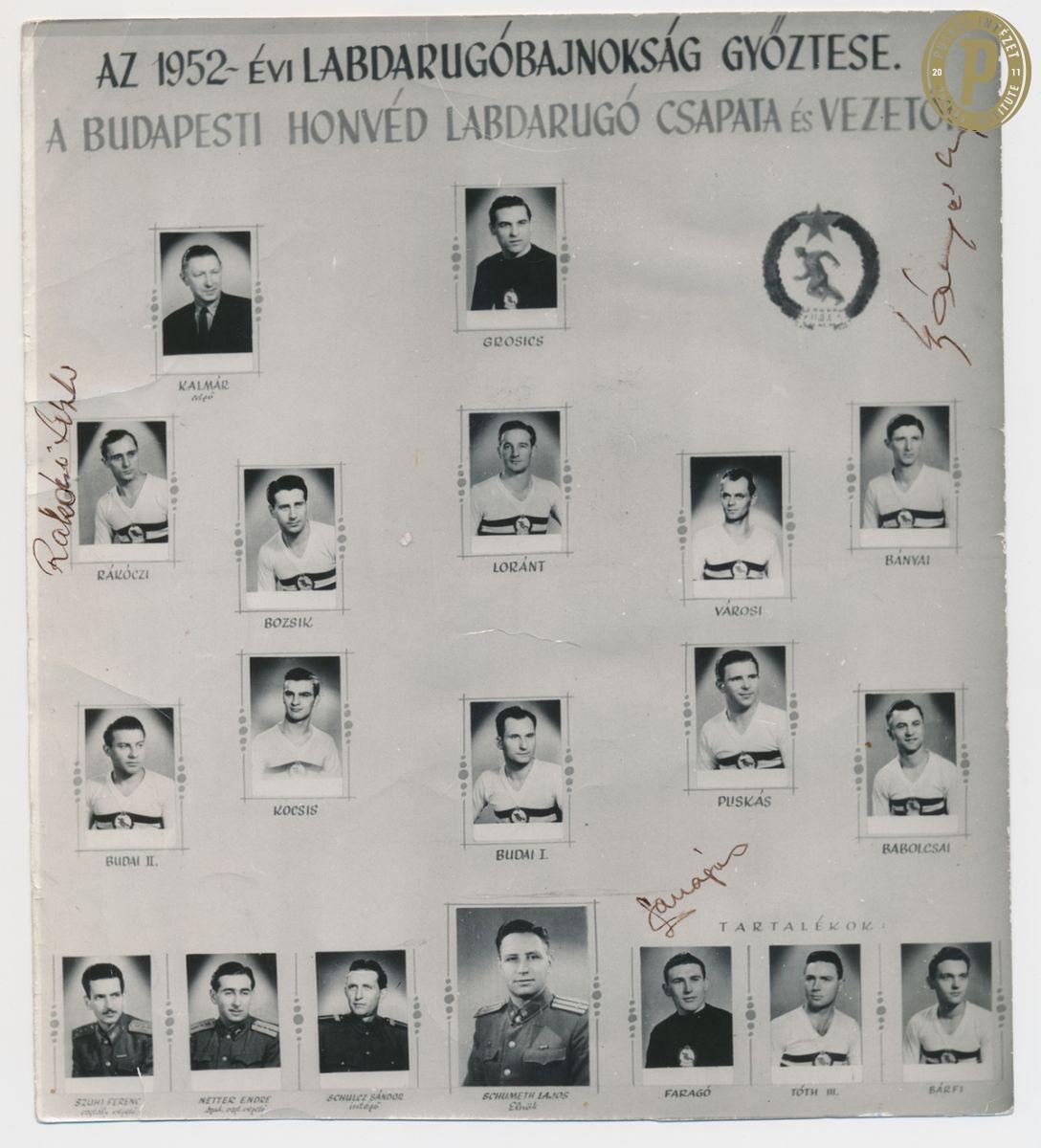A Budapest Honvéd bajnokcsapatának tablója Rákóczi László aláírásával. (Fotó: Puskás Intézet)