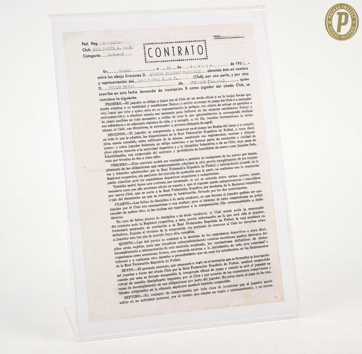 Puskás Ferenc Real Madriddal kötött szerződése. (Fotó: Puskás Intézet/Puskás-hagyaték)