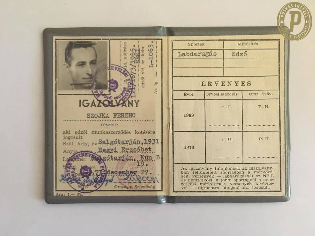 Szojka Ferenc edzői igazolványa (Puskás Intézet)