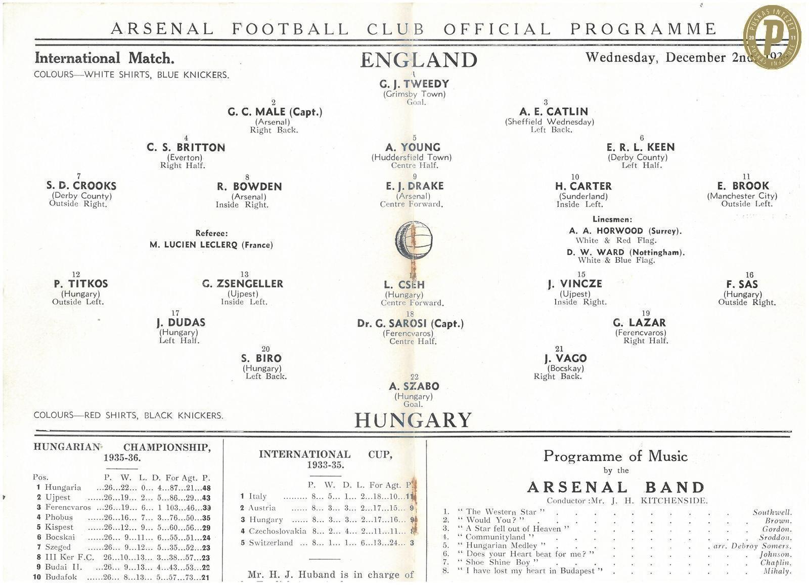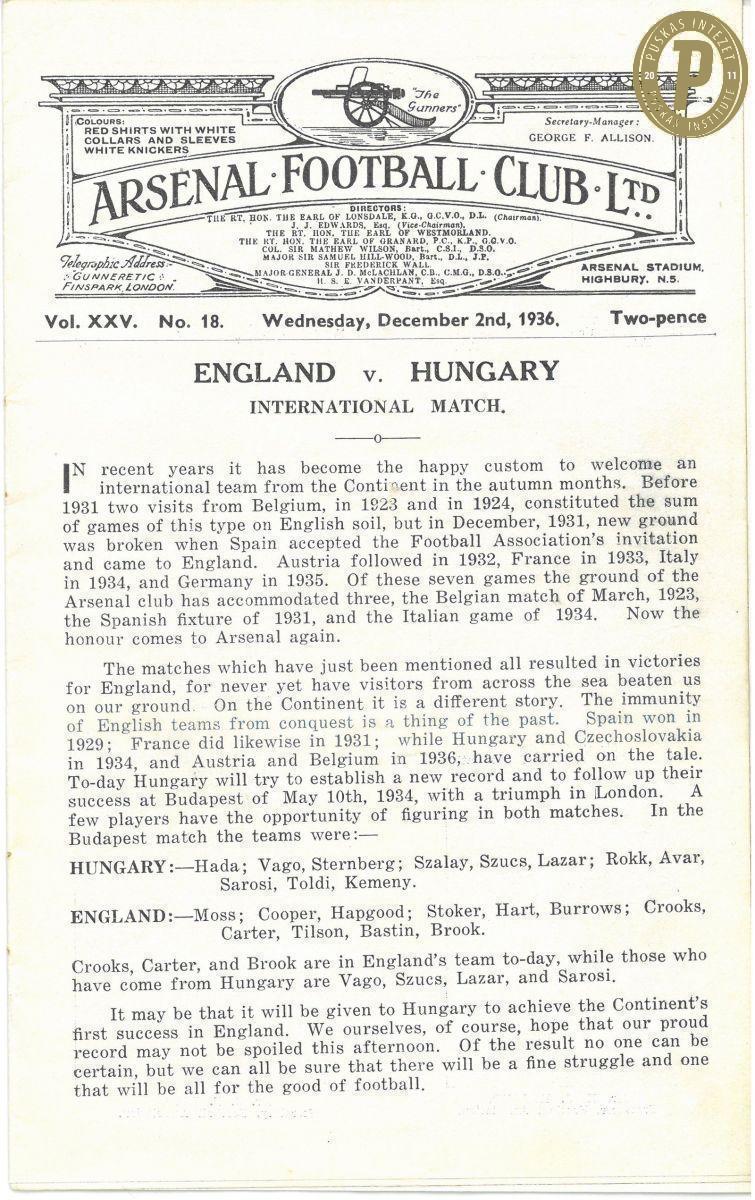 Az 1936. december 2-i Anglia – Magyarország (6–2) mérkőzés programfüzete. (Fotó: Puskás Intézet)