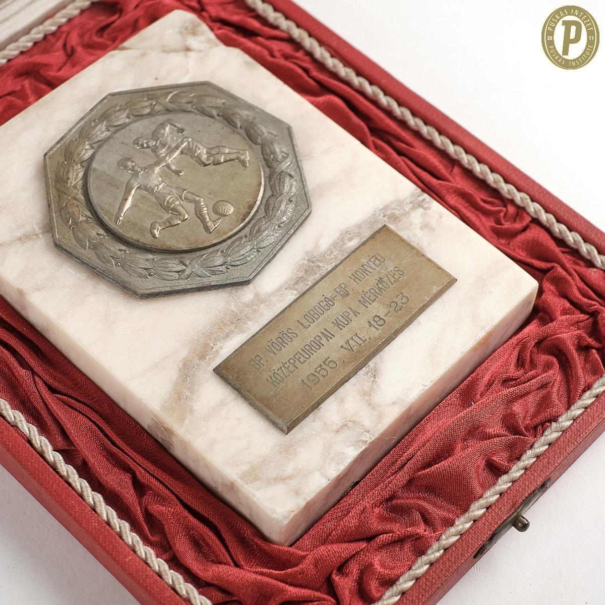 Puskás Ferenc emlékplakketje az 1955-ös Bp.Vörös Lobogó–Bp. Honvéd Közép-európai Kupa-párharcról (fotók: Puskás Intézet/Puskás-hagyaték)